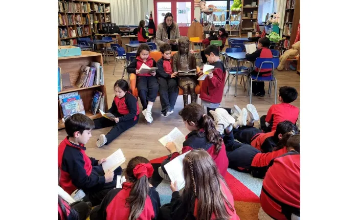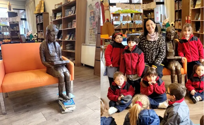 Esta inesperada visita que nos acompañó durante agosto, es una intervención de la escultora Sonia Ubilla, Se trata de la “Niña Lectora”, oda al acto de leer y sus efectos, por ser este un pasatiempo envolvente que no solo entretiene y educa, sino que sumerge a la persona en un estado de concentración pura, donde la mente logra expandirse. La escultora, ex apoderado de nuestro colegio, se inspiró en sus hijas, ávidas lectoras.